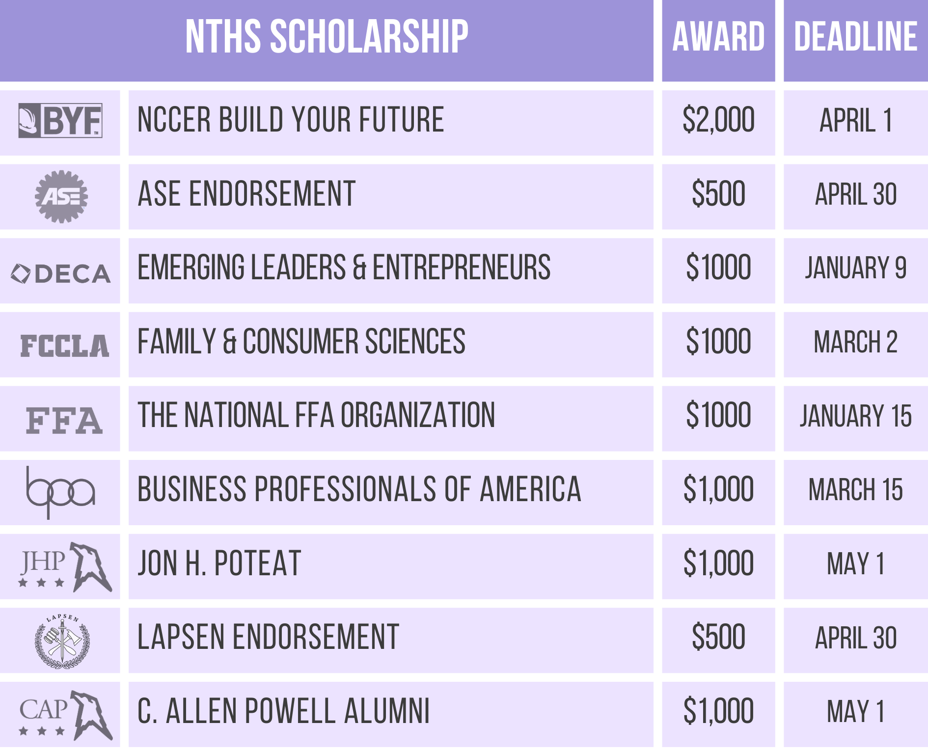 The following NTHS scholarships are currently open. Others will open soon!